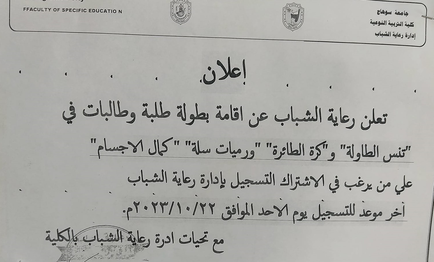 بواسطة portalنشر على 16 نوفمبر، 2023 تعلن رعاية الشباب عن اقامة بطولة طلبة وطالبات ” تنس طاولة ” و كرة الطائرة إقامة بطولة لتنس الطاولة والطائرة والسلة وكمال الاجسام تصفّح المقالات دعوة لحضور ندوة تثقيفية ” لا للمخدرات “دعوة حضور دورة تدريبية بعنوان ( مودة)