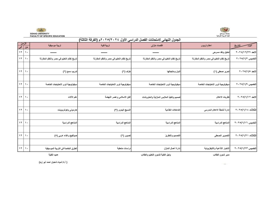 بواسطة amiraنشر على 25 ديسمبر، 2024 الجدول النهائي الفصل الدراسي الأول (الفرقة الثالثة ) 2025/2024 م تصفّح المقالات الجدول النهائي لامتحانات الفصل الدراسي الاول 2025/2024 (الفرقة الثانية )جدول امتحانات الفصل الدراسي الأول (الفرقة الرابعه) 2025/2024