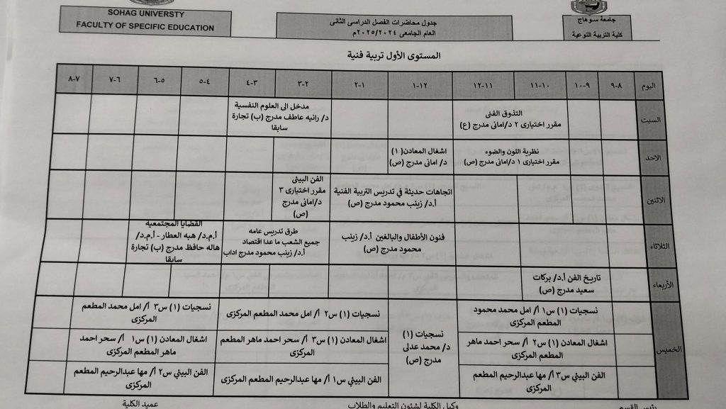 جدول محاضرات المستوى الأول تربية فنية الفصل الدراسي الثاني