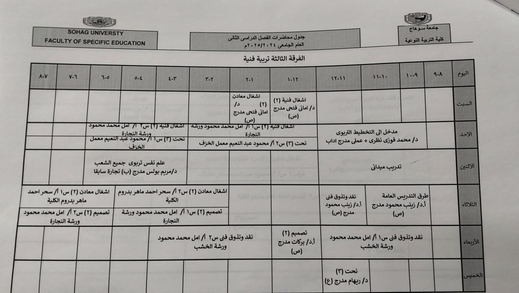 بواسطة amiraنشر على 13 فبراير، 2025 جدول محاضرات المستوى الثالث تربية فنية الفصل الدراسي الثاني تصفّح المقالات ختام فعاليات الدورة التدريبية المنعقدة بالكليهجدول محاضرات المستوى الرابع تربية فنية الفصل الدراسي الثاني