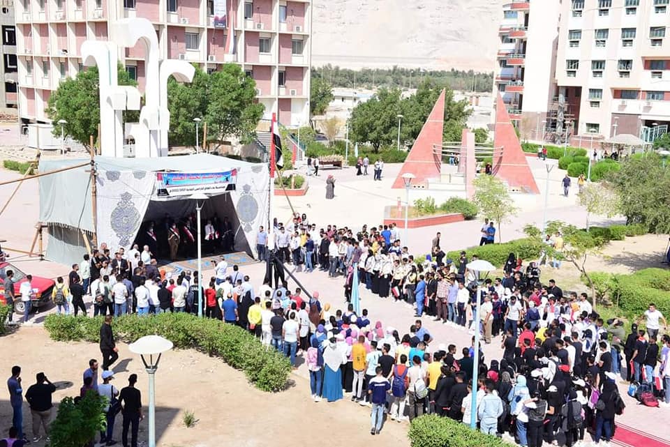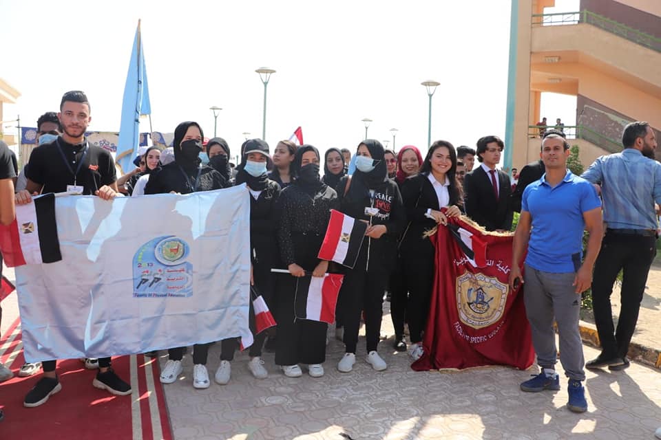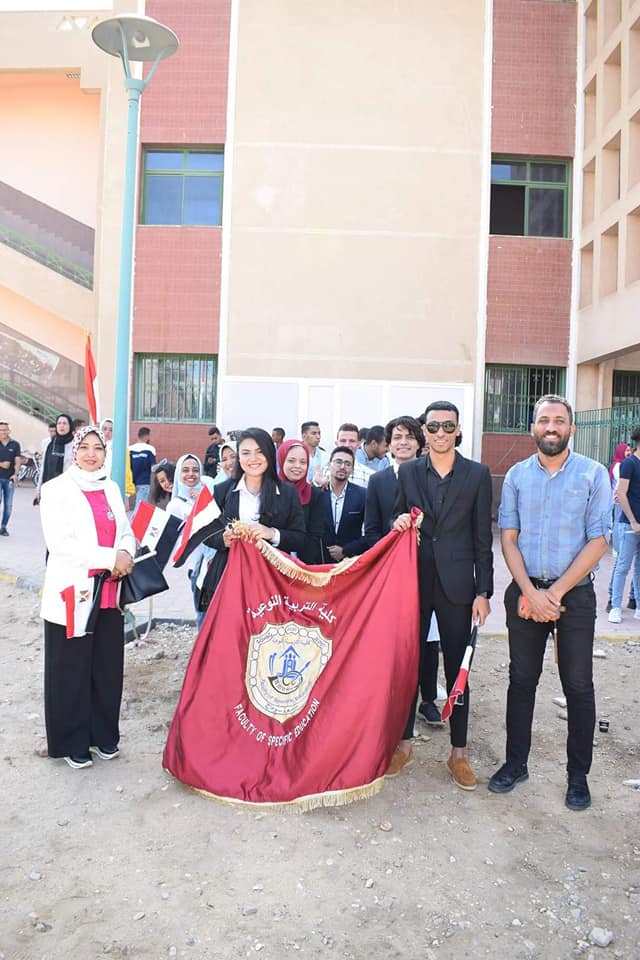 الاستاذ الدكتور زينب محمود الشريف عميد الكلية ووفد من إدارة رعاية الشباب بالكلية و اتحاد طلاب الكلية يشاركون طلاب الجامعة في مراسم بدء العام الدراسي الجديد و تحية العلم الذي نظمته الادارة العامة للرعاية الشباب المركزية بمقر الجامعة بالكوامل بحضور معالي الأستاذ الدكتور مصطفى عبدالخالق القائم بعمل رئيس الجامعة والسعادة نواب الجامعة وعمداء الكليات و طلاب كليات الجامعة.